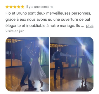 Flo et Bruno sont deux merveilleuses personnes, grâce à eux nous avons eu une ouverture de bal élégante et inoubliable à notre mariage. Ils ont été patients, disponibles et vraiment sympathiques. Si vous souhaitez avoir une ouverture de bal réussie, c’est eux qu’il faut contacter !! Pour notre part, ils nous ont transmis leur passion !